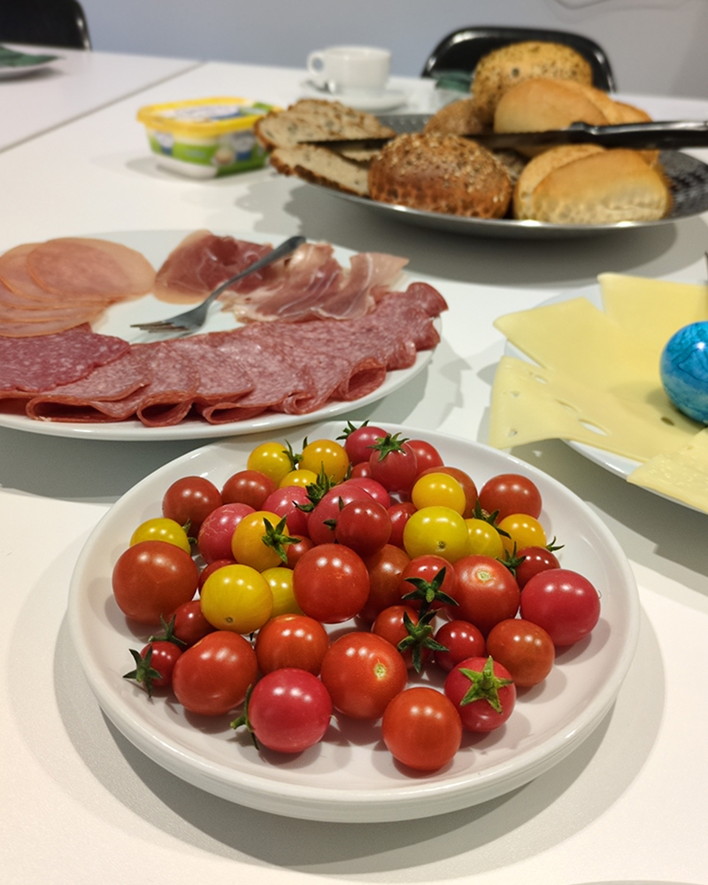 Bürofrühstück mit Tomaten Freitagmorgen = Teamfrühstück 🥐🥚☕Hier geht’s nicht nur ums Essen, sondern auch um Projekte, Organisation und die Tops & Flops der Woche.